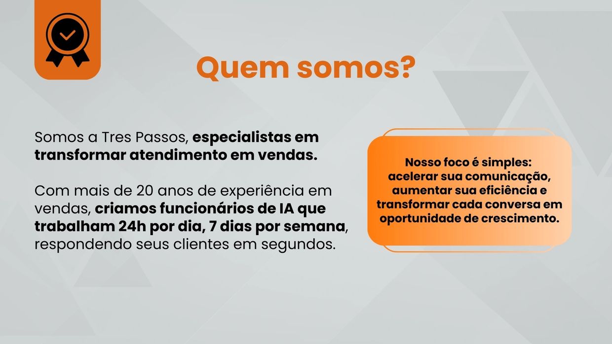 Na Tres Passos, acreditamos que a comunicação eficiente é o motor que impulsiona resultados. Nas empresas de hoje, perder clientes por falta de resposta rápida é um dos maiores gargalos. Foi justamente para resolver essa dor que nascemos: transformar o atendimento em uma experiência encantadora, ágil e que gera vendas.